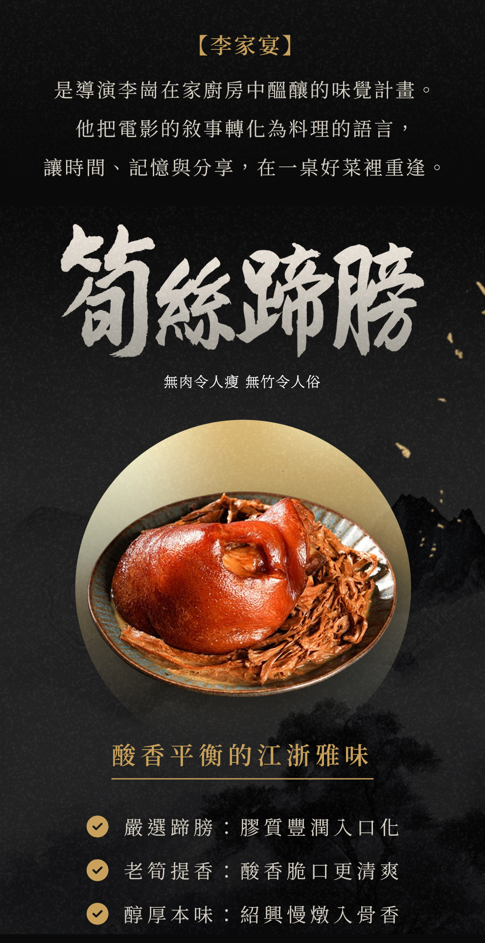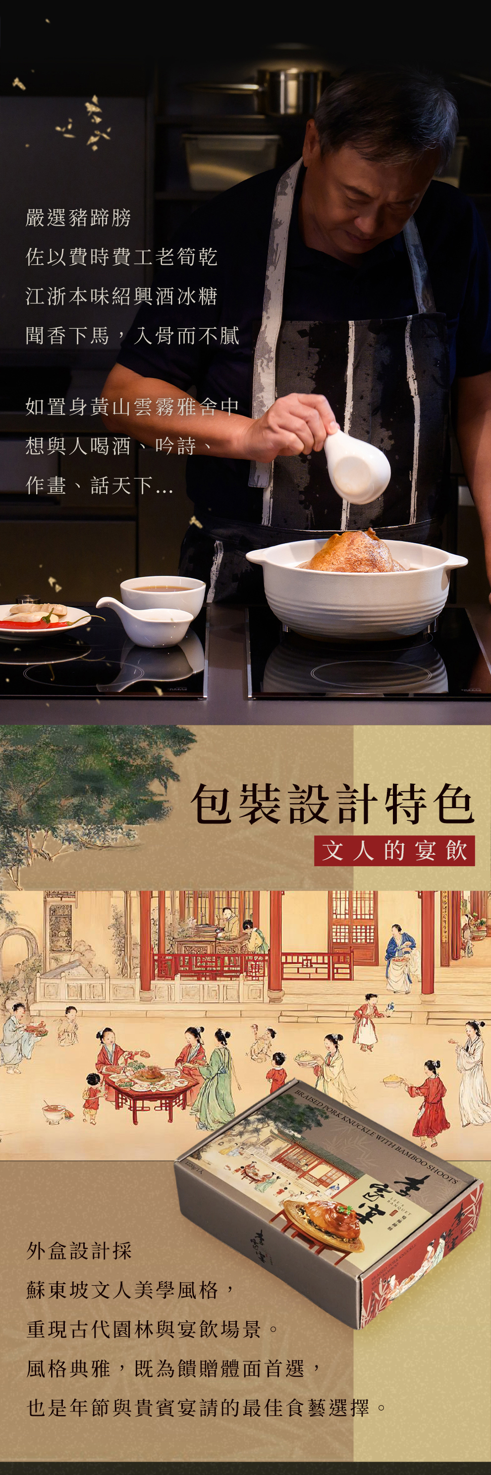 嚴選豬蹄膀,佐以費時費工老筍乾,江浙本味紹興酒冰糖,聞香下馬,入骨而不膩。如置身黃山雲霧雅舍中,想與人喝酒、吟詩、作畫、話天下…。